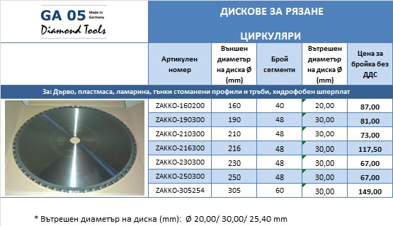 За повече информация и наличности за дискове за циркуляри: Тел. +359 884 43 50 32; E-mail: office@ga05.com