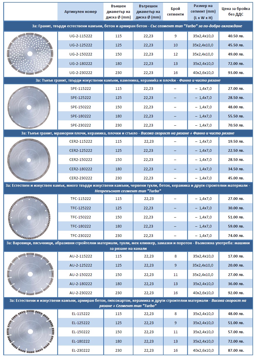 Фирма “ГА 05” ЕООД предлага диамантени дискове за рязане на фуги, плочки, гранит, гранитогрес, мрамор, естествени и изкуствени камъни, керамика, стъкло, бетон, армиран бетон, метал и други строителни материали – за сухо рязане с ъглошлайф или флекс.